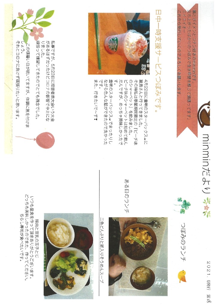 地域と共にあゆむつぼみ&さくらは、障がい者の皆さまの日中一時支援、就労継続支援B型を運営する法人です。個性(障がい)を大切にし、可能性を引き出し、自立力を伸ばすことを基本に、本人や家族の地域生活を支えていきます。1 看護師、ガイドヘルパー、ホームヘルパー、精神障がいホームヘルパー、強度行動障がいホームヘルパー資格を持っている生活支援員が、障がいの程度に応じて支援します。2 昼食は施設内で調理し、温かい食事を提供します。アレルギー食についてはご相談ください。3 病後児についても対応します。4 御自宅まで送迎を致します。5 保護者の皆様、地域の皆様も含めて、障がいや病態を理解するための講演会等を開催します。